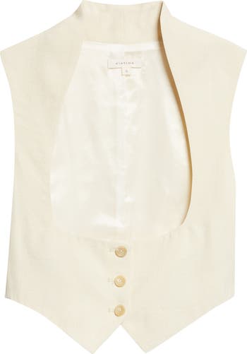 A featured piece in Rachel Scott's spring '26 runway presentation, this vest embodies the Bacchanal theme with its curvilinear décolleté neckline paired with a cropped length, fluidly ungendering a traditional menswear staple.
