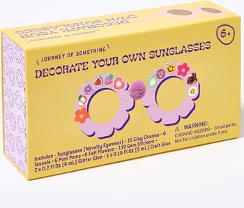 JOURNEY OF SOMETHING: DECORATE YOUR OWN FLOWER SUNGLASSES KIT - Encourage creativity and self-expression with the Decorate Your Own Flower Sunglasses Kit, a fun and stylish craft set designed for endless imaginative play! Using colorful charms, pom poms, tassels, and gem stickers, young fashionistas can customize their own pair of flower-shaped glasses to create a bold and unique accessory. Perfect for rainy days, playdates, parties, or as a creative gift, this kit allows kids to design and personalize their own fashion statement. While these sunglasses are a playful accessory and not for UV protection, they’ll add a sparkling touch to any outfit. Pair with the adult-sized heart sunglasses kit for a fun mommy-and-me crafting experience! WHAT’S INCLUDED: 1 Flower-Shaped Sunglasses - A playful frame for decorating. 15 Clay Charms - Cute and colorful embellishments. 2 Glitter Glues - Add sparkle and shine. 1 PVA Glue - Easy application for decorations. 6 Pom Poms and 6 Tassels - Fun textures for extra flair. 50+ Gem Stickers - Bling it up with sparkly gems. 6 Felt Flowers - A floral touch for stylish designs. 1 Drawstring Glasses Bag - Store your masterpiece safely. WHY YOU’LL LOVE IT: Encourages Creativity and Self-Expression - A fun way for kids to personalize their accessories. Perfect for Ages 5 and Up - A creative DIY project designed for young crafters. Great for Parties and Playdates - A unique group activity that sparks imagination. Pairs with the Adult Kit for Family Crafting - A delightful mommy-and-me experience. NOTE: Stylish accessory only - not designed for sun protection.