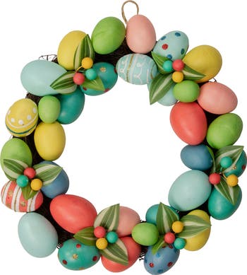 This wonderful Easter egg wreath is a must have for the holiday. Expertly colored eggs are attached to a twig backing, with green foliage tucked in all the right places. The perfect addition to your Easter celebration. Product Features: Colorful eggs Easter wreath Sturdy twig backing Comes in 1 piece Recommended for indoor use - if using outdoors place under a covered area Dimensions: 14” diameter (measured from outermost edge to outermost edge across the wreath) Material(s): foam/plastic/twig