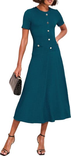 Feel your most confident in this desk-to-dinner midi dress made of a softly textured jersey and kissed by decorative buttons that sparkle in the light.