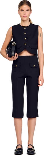 Sleeveless fine knit crop top with a button fastening at the front, round neck, flap patch pockets and a rounded hem at the front.