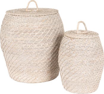 Decorative Hand-Woven Rattan Storage Baskets with Lids, Whitewashed, Set of 2