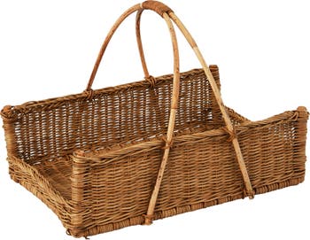 - A cottage-inspired hanging basket that features intricately handwoven rattan finished with a natural handle