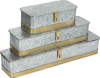 This set of three rectangular nesting metal storage boxes is a decorative and functional product that can enhance any space. The galvanized boxes have an antique gold band and clasp, giving them a rustic, industrial, or vintage look. Each box is nestable allowing them to be stored inside each other when not in use. The largest box measures 20.5 inches in length, 4.8 inches in width, and 3.5 inches in height. Use for standalone decor on shelves or as storage to hide away remotes, jewelry, keys, coins, or stationery.