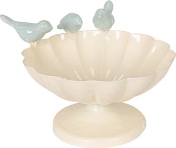 • An enchanting metal bowl featuring a scalloped design with 3D birds on the rim in antique white and blue