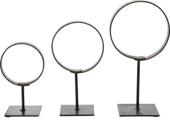 Created from found iron, this set of 3 metal rings on stands have a naturally rustic appearance that allows them to easily stand out from the rest of your home or office decor. Featuring a combination of a clean design and a rugged look, they add character and personality to any decorative setting that they are featured in. Display these unique decor proudly as part of your desk, table, or shelf decorations in the bedroom, living room, hallway, or entrance area. They are a wonderful option for any modern rustic or industrial themed setting and look especially striking paired with other small decorative items on a console or end table.