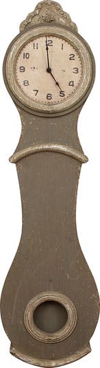 - A rustic and charming accessory, this reclaimed wood wall clock features a classic grandfather silhouette in a distressed grey finish