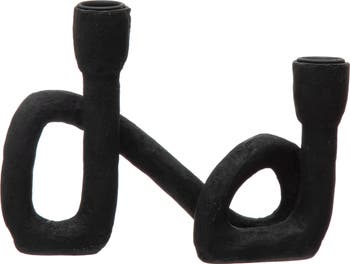 Illuminate the home with this black resin double taper candle holder. This candle holder features a unique and artistic shape that resembles two intertwined loops. The matte black finish adds a touch of sophistication and contrast to any space. This candle holder can hold two standard wax or LED taper candles (not included) that create a warm and cozy atmosphere. It measures 8.5 inches in length, 2.5 inches in width, and 6.25 inches in height. Whether placed as a statement piece or with a complementary grouping, this candle holder will be a wonderful accent for the living room, dining room, kitchen, bedroom, or office.