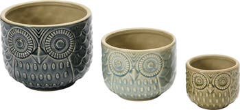 - A charming set of three stoneware owl planters that feature a crackle glaze and a multi color design