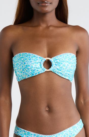 A dainty floral pattern lends depth to this strapless bikini top with a bold O-ring in the center.