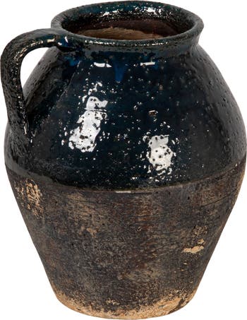 - A stunning decorative terra-cotta pitcher/vase with a distressed finish and reactive glaze in a rich blue hue