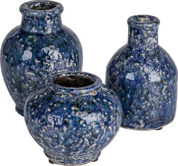 - A set of three beautiful and unique terra-cotta vases that have a crackle glaze and a navy color