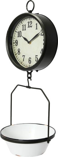 - A unique and charming accessory, this wall clock features an attached scale in a white and black enameled finish that gives it a vintage and rustic look