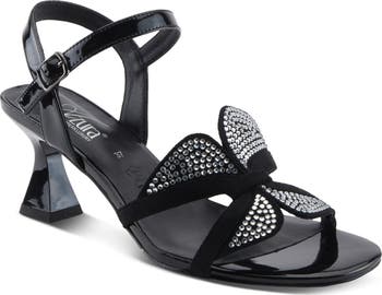Clear crystals bring glamorous sparkle to the butterfly-shaped straps of this event-ready sandal lifted on a graceful sculptural heel.