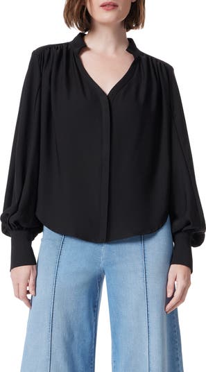 Sandwashing gives a sueded feel to a shirt created in a flowy silhouette that's enhanced with lots of gathering and framed by billowy sleeves.