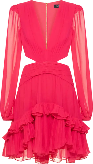 - This deep neck, plunge chiffon dress features pleated detail and ruffle trim. Ribcage cut-outs and flowy sleeves. Mini dress is fully lined. Exposed back zipper.