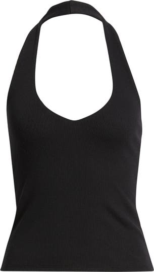 A deep V-neckline brings flirty allure to this fitted halter top cut from a lightweight cotton blend.