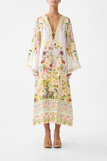 Inspired by Catalan Modernist architecture and the Spanish Nouveau movement, the The Call Of Catalonia Deep V Neck Hardware Kaftan is a handcrafted silhouette designed by our in-house artisans. Reimagined in an exclusive limited edition print, our longline kaftan exhibits a dramatic plunging V neckline accented with bespoke hardware. Relaxed fitting, adorned with generously flared sleeves and leg split for effortless movement and allure.