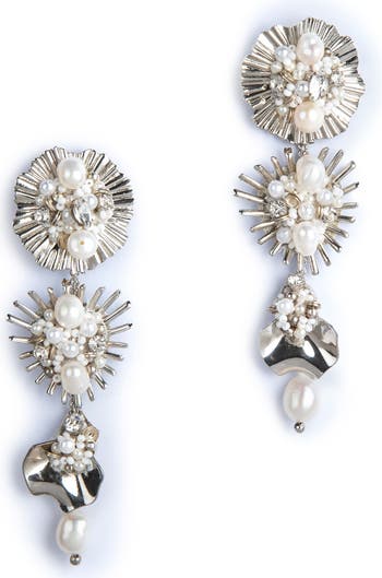 Striking textures define these drop earrings crafted with beads, crystals and imitation pearls.