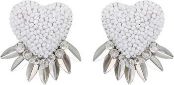 These sweet and stunning heart earrings handmade with vibrantly hued beads are anchored by golden sequins and feather-shaped fringe.