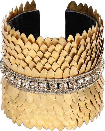 This bold cuff bracelet centered with a line of crystals and clad with tiers of feather-like fringe brings texture to night-out looks.