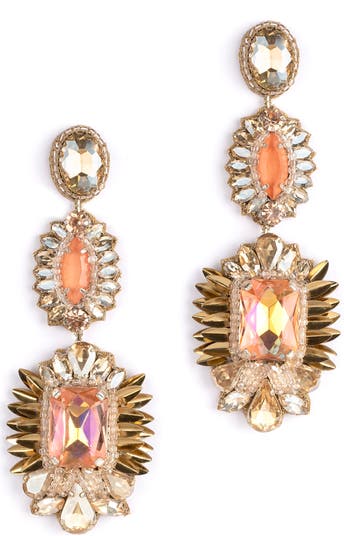Feathery sculpted petals and glass beads punctuate each tier of these shimmering statement earrings showcasing a sparkling mix of crystals.