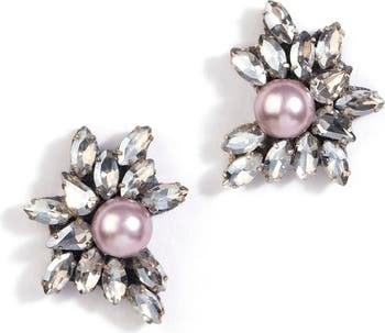 Glossy imitation pearls center these stud earrings covered in light-catching crystals.