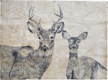 - Deer and Fawn Wall Art Sign Panels for Christmas Decor made from a paper mix material measuring 34 inches high by 45 inches long and 0.06 inches wide features metal grommets for easy hanging and is designed for indoor use only.
