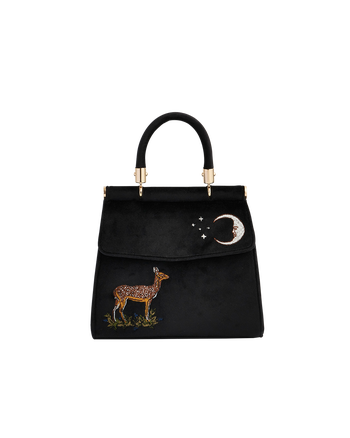 Crafted from soft black velvet, this bag has a structured silhouette adorned with detailed embroidery depicting a fawn gracefully positioned beneath a celestial crescent moon an embodiment of the feminine, symbolising the rhythm of time and the enlightenment of nature. Designed for both beauty and functionality, the bag comes complete with a top handle for easy carrying with an optional cross-body chain strap for hands-free convenience. The magnetic fastening ensures your most cherished possessions are securely held within.