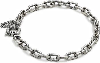 An aged finish lends a vintage-inspired look to this industrial lock-chain bracelet made from sterling silver.