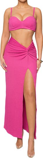 Make a modern, scene-stealing statement in this textured two-piece set that pairs a bra-style top with a flirty maxi skirt featuring a shapely twist design.