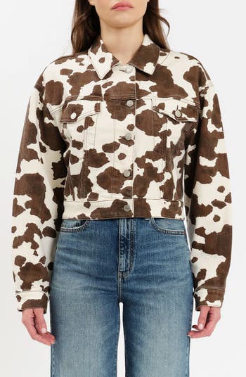 Dropped shoulders enhance the relaxed fit of this cropped stretch-kissed denim jacket covered in bold animal spots.