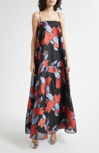 Jacquard florals bloom in bold scale across lightweight organza on this flowy evening dress suspended from slender straps and shaped in an elongated, airy silhouette.