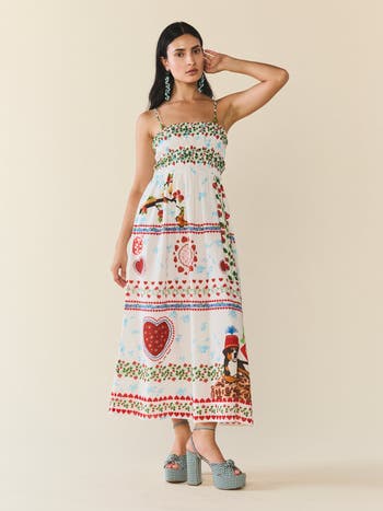 Meet the Delia Dress, a fresh silhouette that brings an artful approach to your wardrobe. This easy body features a comfortable smocked bodice that ensures a flexible fit, perfectly complemented by thin adjustable strap finished with a whimsical green bead detail. The dress serves as an effortless canvas for our signature conversational print, a mix of red hearts, butterflies, and bandana motifs that adds a wink of Southern sass to any outing.