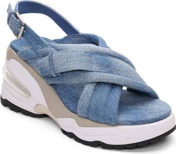 Denim straps refresh this slingback sandal grounded by a chunky wedge heel that delivers a sporty yet styled profile.