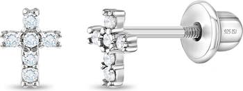 A special gift for the special little girl in your life. Embedded with quality cubic zirconia stones, these hypoallergenic cross earrings are crafted in 925 sterling silver and are safe for children with sensitive ears. The posts are threaded and feature a safety back system to ensure your child's earrings stay comfortably in place. These earrings make a perfect gift for the Christian child in your life. Complimentary gift box is included for easy giving!