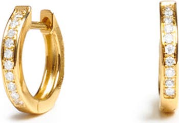 Add a touch of elegance with our Delicate Diamond Huggies. Featuring finely crafted diamonds in a timeless design, these petite earrings offer just the right amount of sparkle for everyday sophistication. Subtle yet stunning, they’re the perfect finishing touch for any occasion. Details: Diamond huggie earrings 14k solid gold 20 round, natural diamonds Total carat weight: approximately 0.104 per pair Dimensions: approximately 1.8 mm Outer diameter: 12 mm Width: 2.1 mm
