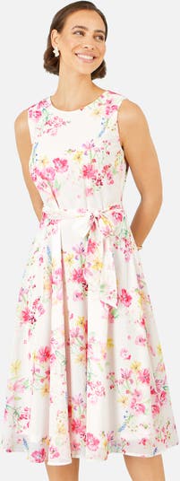 This elegant dress is a timeless choice for warm-weather occasions, offering a fresh and feminine feel. Designed with a sleeveless silhouette, it features a softly flowing skirt that moves beautifully with every step. The delicate floral print adds a romantic touch, while the self-tie waist defines the figure for a flattering, polished look. Perfect for garden parties, summer events or daytime celebrations, this dress blends effortless style with graceful detail.