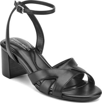 Interlocking straps bring subtle dimension to a two-piece leather sandal lifted by a stacked heel and fastened with an adjustable buckle closure. Premium underfoot cushioning and a flexible sole deliver comfort and stability.