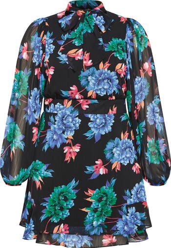 A dark background showcases the bold blooms patterning a tie-necked dress that works for desk days and drinks dates.