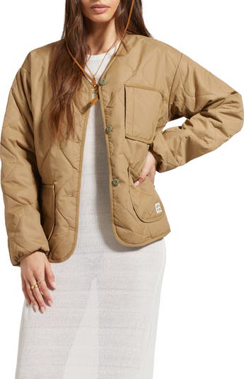 Everyday sophistication meets lightweight utility in this quilted button-front jacket featuring a water-repellent finish.