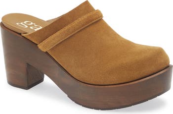 A wood platform brings a bit of retro attitude to this modern clog fashioned from smooth suede.