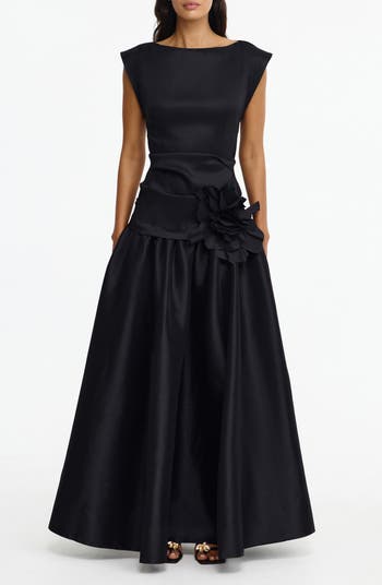 Minimalist lines give way to dramatic flourish on this satin dupioni drop-waist gown designed with a gently ruched bodice and a laser-cut floral appliqué. The skirt billows into a full A-line silhouette that sweeps the floor with unapologetic grandeur.