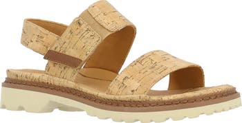 Cork-inspired straps lend an earthy vibe to a summery sandal built on a contoured footbed cushioned with memory foam to comfort each stride.
