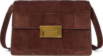 Neatly woven suede lends soft yet structured appeal to an espresso-colored clutch finished with gleaming hardware.