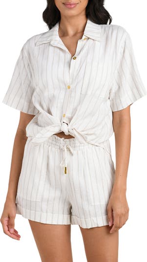 Glimmering golden buttons and subtle stripes detail this linen-blend button-up shirt that ties at the waist and is perfect for a seaside lunch.