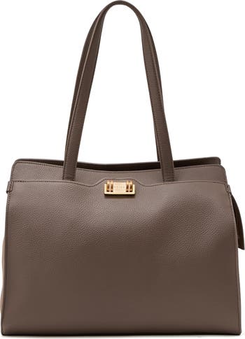 Logo-engraved hardware glints against the finely grained leather of a voluminous tote featuring multiple compartments perfect for organizing your everyday necessities and then some.