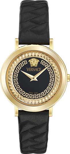 The brand's Greek key motif echoes around the matte dial of this elegant Swiss-made watch punctuated with an iconic 3D Medusa head and set on a textured leather strap