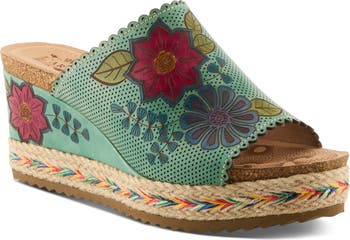 Colorfurl threads highlight the braided trim of this endlessly artistic wedge sandal featuring hand-painted flowers and a comfort-enhancing cork footbed.