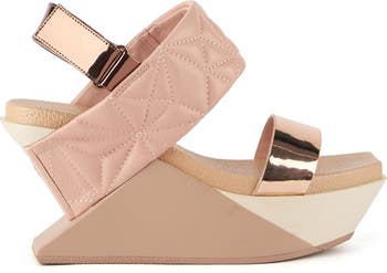 The Delta Wedge Sandal is a square toe sandal lifted by a bold, cantilevered platform. It features puffy, quilted leather straps fitted with velcro closures and a springy contoured footbed, offering ultimate comfort and a customized fit.